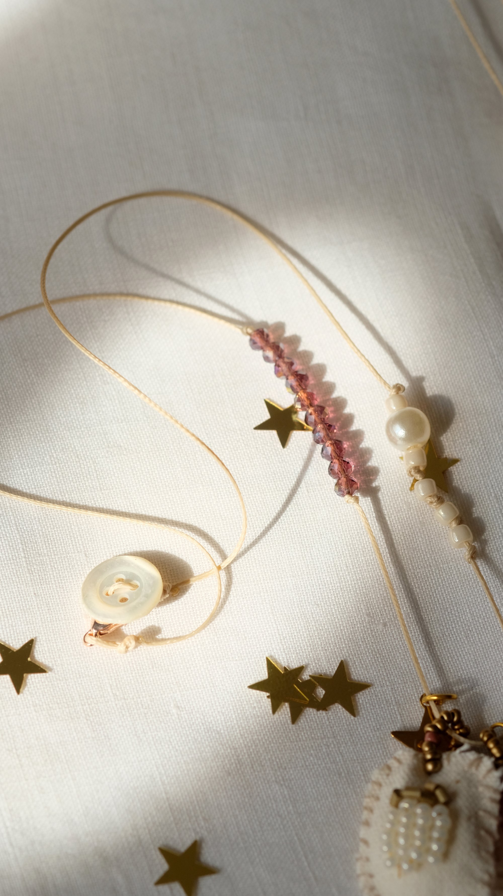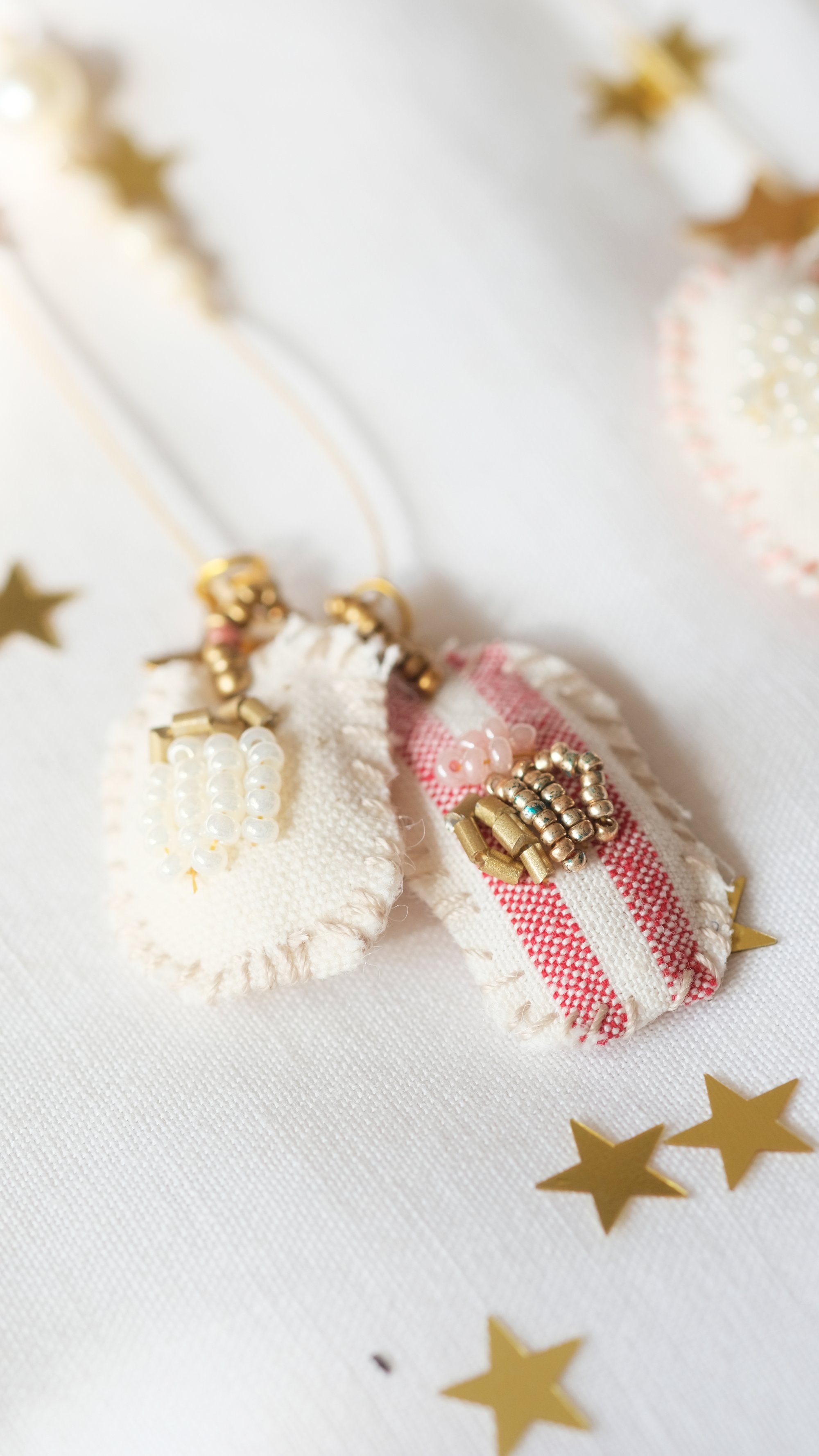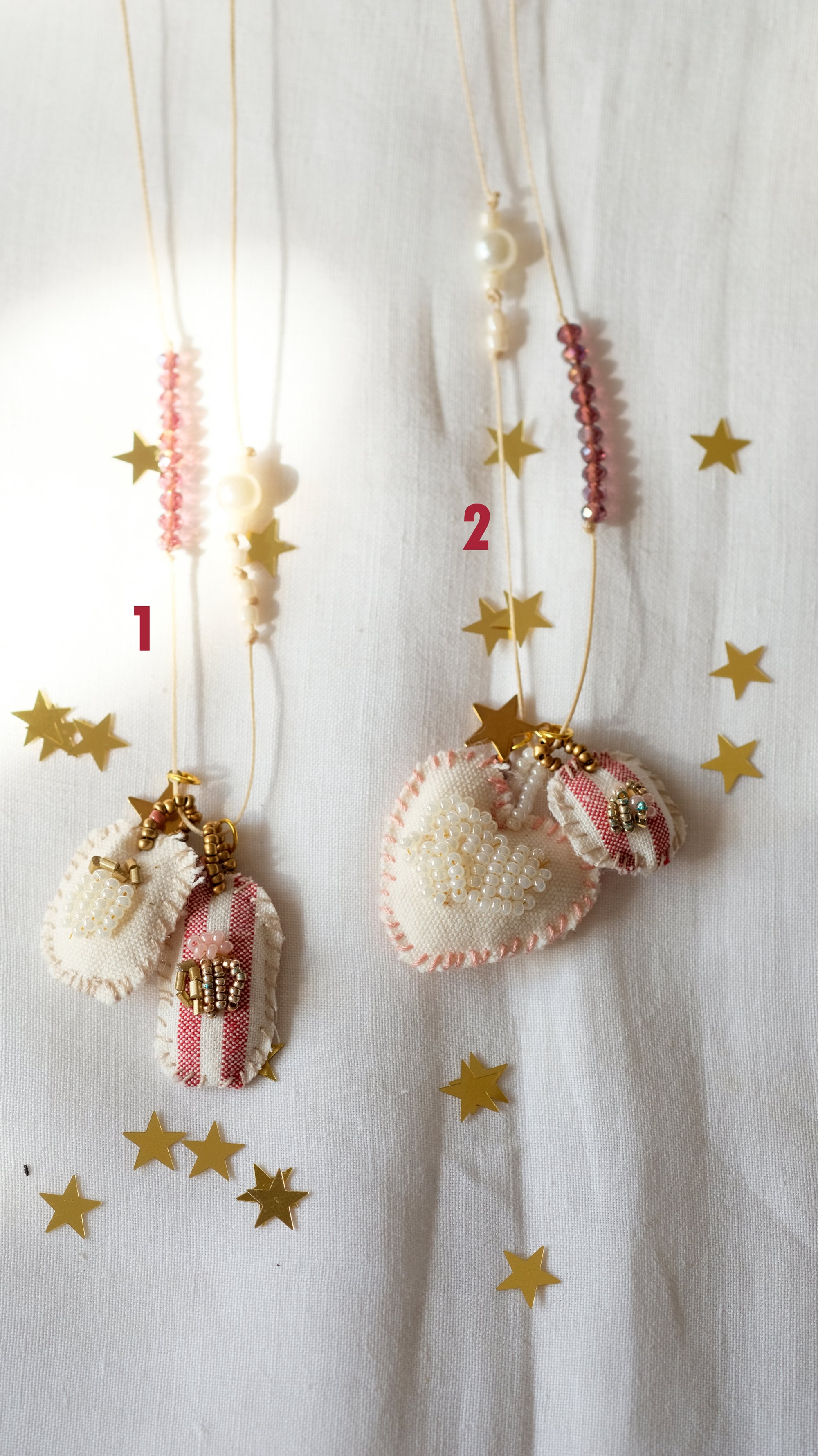 Collana con pendenti in tessuto di cotone con pendente a righe panna e rosa con applicazione di perline, ricamo a mano e DUE VARIANTI: