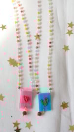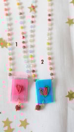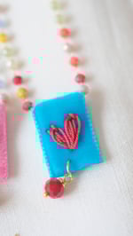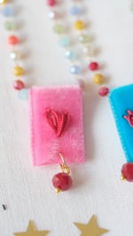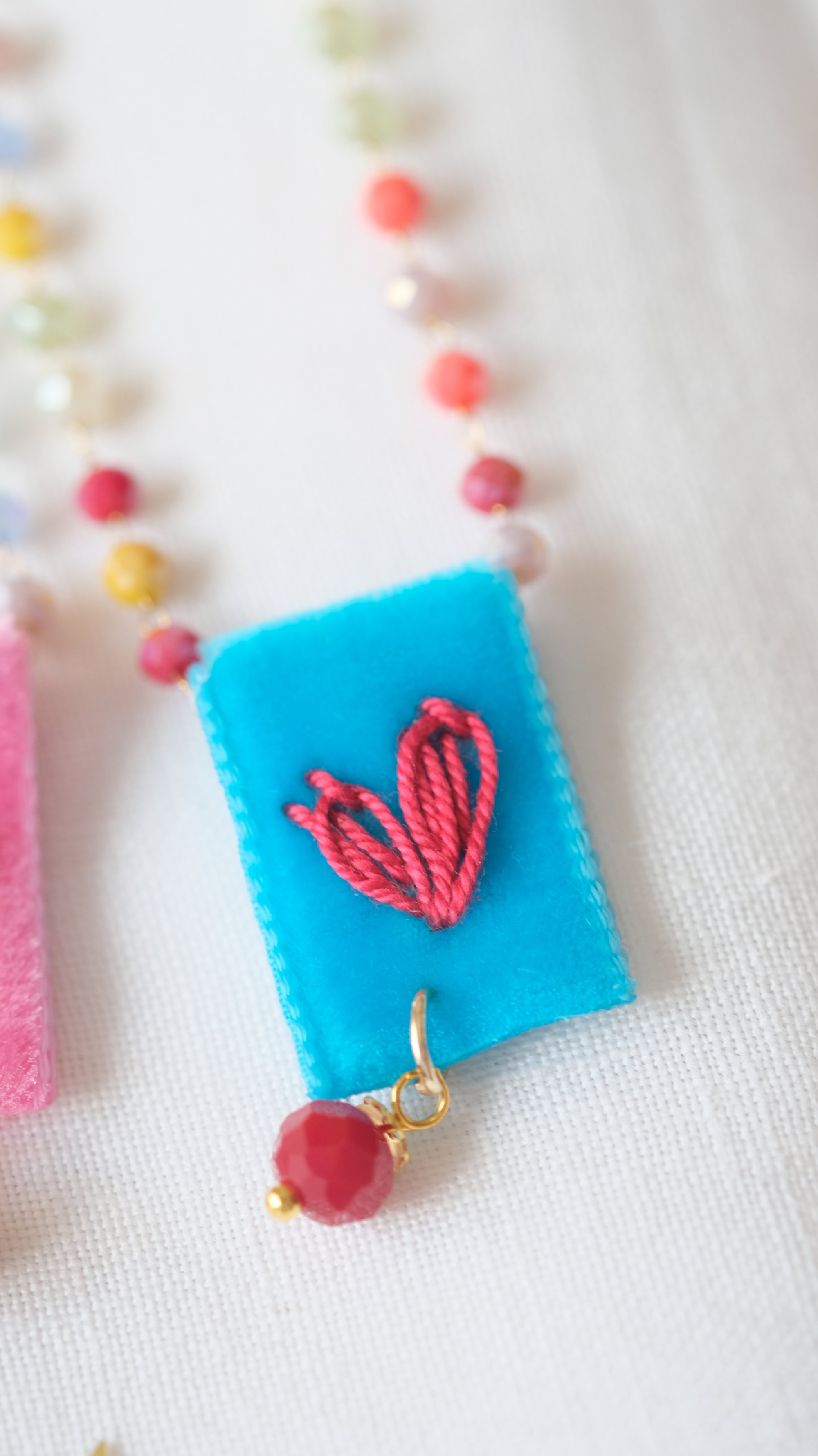 Collane pendente realizzato in velluto, nelle varianti rosa e azzurro, con cuore ricamato a mano.