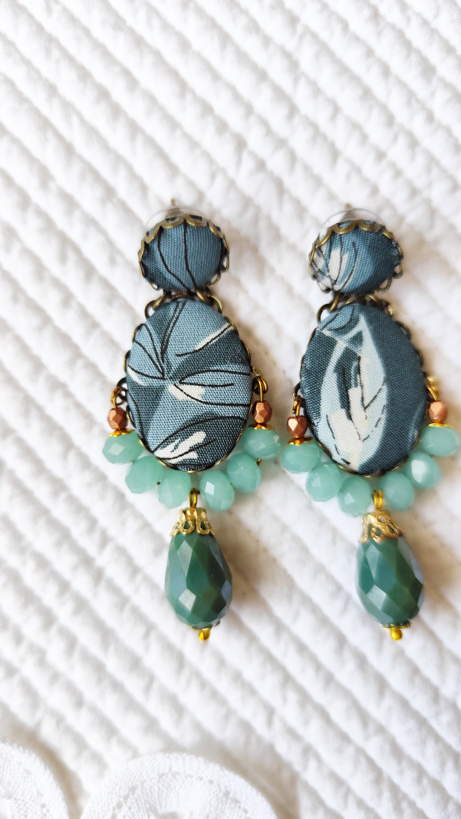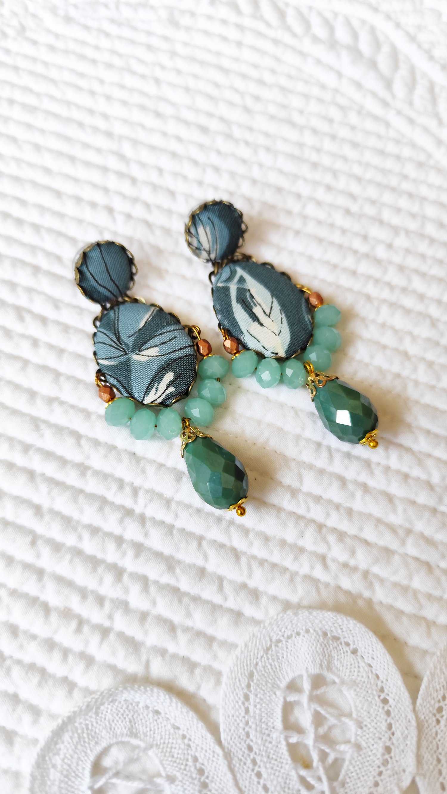 Orecchino composto da una base ovale in ottone con l'interno in tessuto fantasia floreale, tono su tono, molto delicata