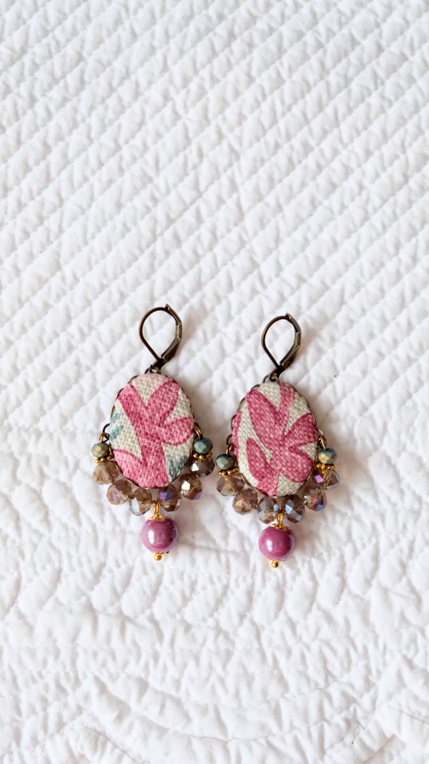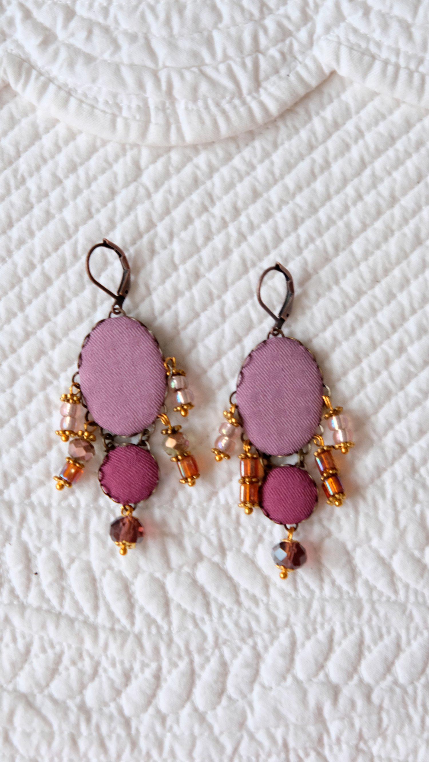 orecchino composto da due ovalini, basi ovali in ottone con inserito all'interno ovali ricoperti in tessuto in due tonalità di rosa antico.