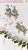 Orecchino composto da due basi ovali in ottone con l'interno in tessuto fantasia azzurro e grigio.