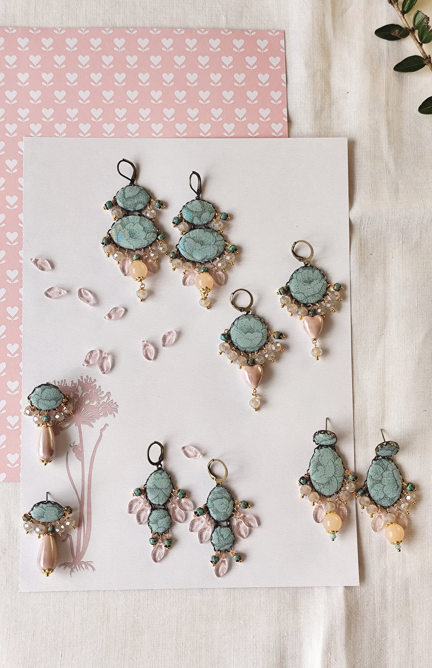 Cristalli in azzurro polvere e rosa, foglie in cristallo rosa, perla in quarzo rosa.