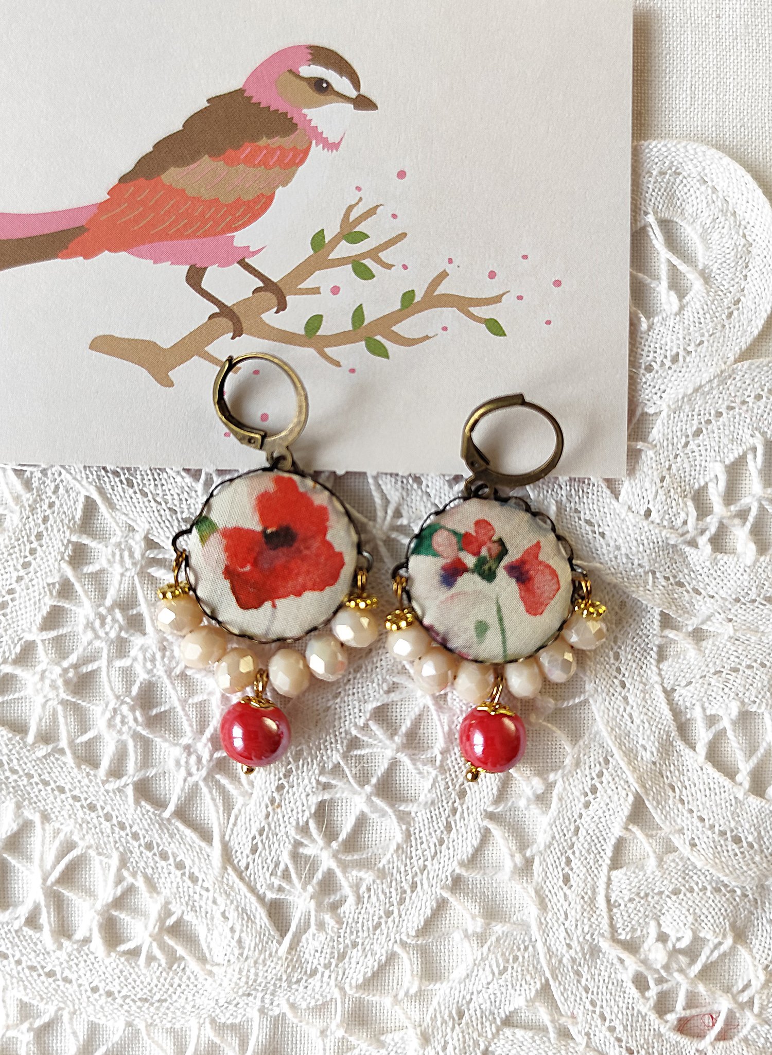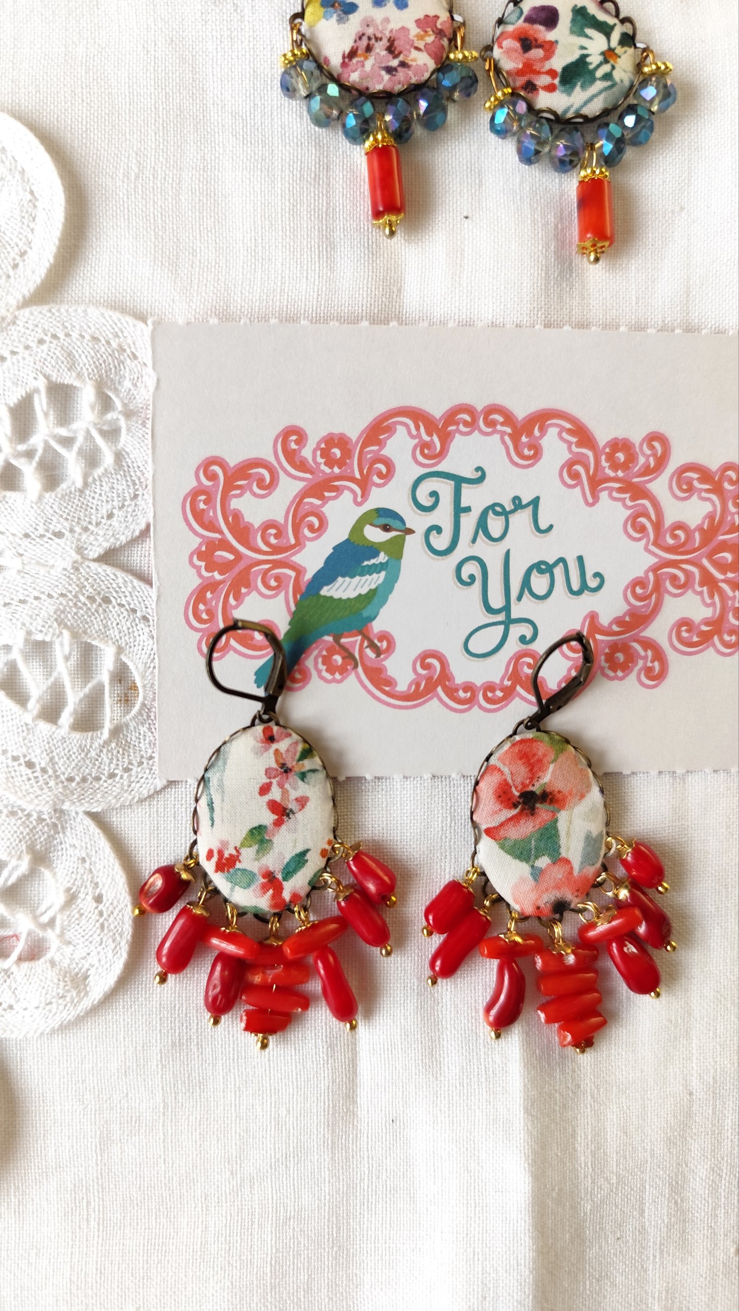 OrecchinI con base tonda in ottone, con l'interno in SETA stampa con fiori ad acquerello.