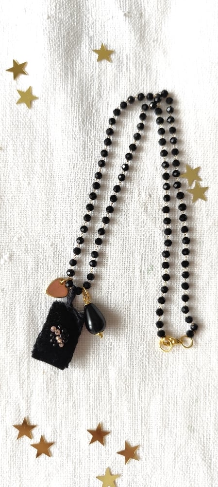 Collane con ciondolo in velluto nero, con ricamo di perline. Goccia in onice nera. Charms cuore in metallo dorato. Catena rosario con cristallini neri. Lunghezza cm 25 complessivi.